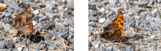 I was hoping this was the case for my mystery butterfly. Sure enough, within a few moments it returned to hide in the leaves of a beech tree. I was trying to convince myself that the roadside wasn’t that steep and I could clamber closer, when the butterfly obligingly flew close enough for a photo. Yup, that “dead leaf” in the photo is a question mark butterfly.