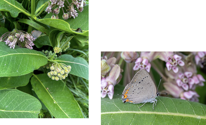 This was the first one I had seen. If I hadn’t been looking closely I would have missed it. In the photo to the left you can see a beetle on the top leaf. Once you find the hairstreak, in the same photo, you can get a sense of just how small hairstreaks are.