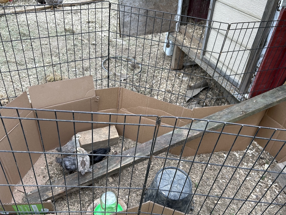 They are not happy when I carry them outside and their little cheeps take on a frantic tone. But then I set them inside their X-pen (with the bottom reinforced with cardboard so they can’t squirt through the bars. Yes, I can learn – happy about that).