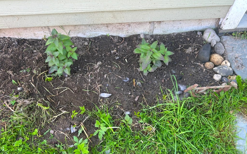 The two Bee Balm plants that my sister gave me have grown from scrawny seedlings into bushy plantlets. I planted them next to the garage in a small area I cleared of grass and waterleaf and misc other weeds, It’s a small plot, tiny really, just the two plants. But for some reason it makes me happy to see the plants there and doing so well.